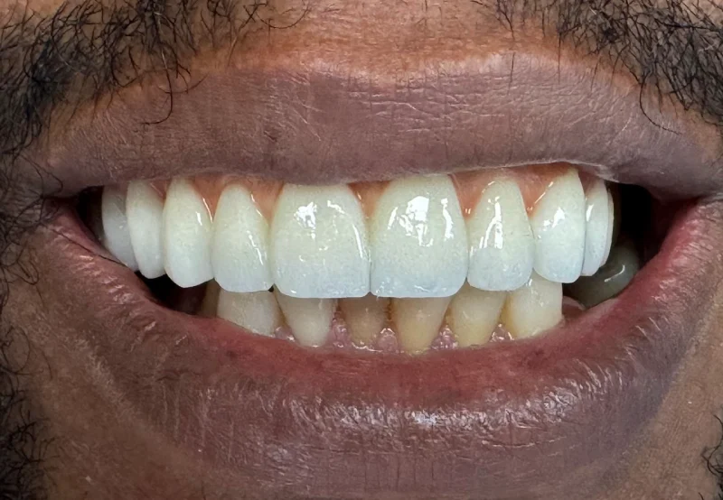 Result: The veneers look natural and fit comfortably. The patient was satisfied with the restoration and is now able to smile openly and interact with friends without hesitation.