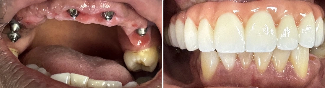 Result: The patient left with a strong, natural-looking smile. Chewing is now easy and comfortable. Daily care is simple — just brush like you would with natural teeth and visit us once a year for a check-up.